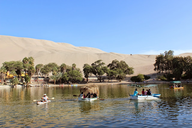 आता या भागातील भटकंती, पराकासवरून आता जरा समुद्रापासून दूर ईका शहराकडे प्रस्थान. जवळच पिस्को नावाचे शहर आहे. त्या नावाची ब्रॅन्डी इथे फ़ार् प्रसिद्ध आहे. त्याच्या वाईनरीज्/डिस्टिलरीज् जवळपास आहेत. त्यातील एकाला भेट दिली. 'टकामा' दारूभट्टी शतकाहून जुनी व अजून कार्यरत आहे. 'पिस्को सोअर्' या नावाने प्रसिद्ध इथली मदिरा जणु पेरूचे 'राष्ट्रीय मद्य' आहे. ईथून इका जवळच आहे. आता आपण भर वाळवंटात आहोत. जगातील सर्वात उंच वाळूच्या टेकड्यांचा हा प्रदेश आहे. शहराच्या पश्चिमेला अगदी जवळच एक निसर्गाचा चमत्कार, व्हाकाचिना मरूद्यान आहे. उंचच् उंच वालुकापर्वतांच्या मध्ये एक सुंदर तलाव आणि त्या पाण्याच्या आधाराने वाढलेली रम्य हिरवळ. इथेच बर्फ़ाप्रमाणे वाळूचे खेळ खेळता येतात. 'स्नो बोर्डिंग' ब्लॅक डायमंड लेवल् पर्यंत येत असल्याने सॅन्ड्बोर्डिंग अजून मजेदार वाटले. एक बग्गी दिलेली होती, ती आपल्याला टेकडीवर घेऊन जाते आणि मग आपण घसरत खाली यायचं, परत बग्गी दुस-या टेकडीवर घेउन जाते, असा हा सूर्यास्ताजवळच्या एक दोन तासांचा खेळ. वाळवंट असलं तरी तापमान इथे खूपच कमी असते. इथूनच पुढे जगप्रसिद्ध नाझ्का रेषा आहेत. तिथे विमान सफ़र उपलब्ध आहे. तेथील गूढ अद्यापही तसेच असल्याने फ़क्त बघून परत यायचे एवढेच. त्याविषयी जालावर भरपूर माहिती आहेच्, त्यामुळे त्याविषयी अधिक नंतर कधी.