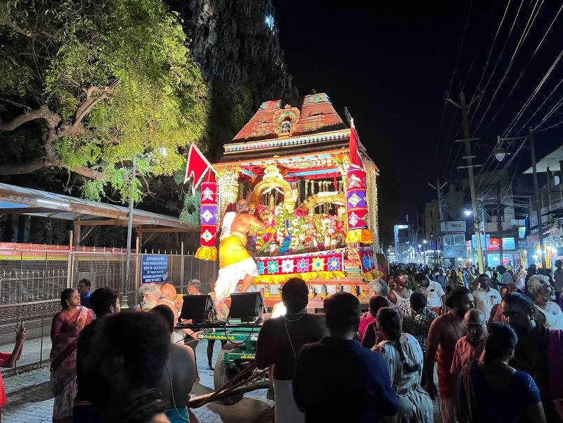 मंदिरातील देवतांची पालखी संध्याकाळी ७ च्या सुमारास पूर्व गोपुरातून